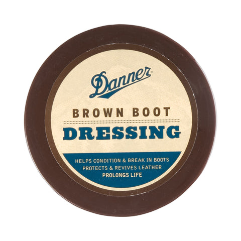 Danner Boot dressing is formulated to keep full-grain leather from drying and cracking and should be used to recondition boots after hard use. Can also be used to help soften leather when breaking in new boots. The compound is water resistant and allows for breathability, which is especially important for the performance of GORE-TEX lined boots. For use on full-grain leather only.